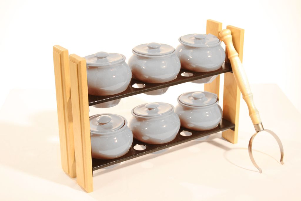 Набор из 6-х горшков, емкостью 0,5 л, с ухватом, на полке. Упаковка: прозрачная пленка.