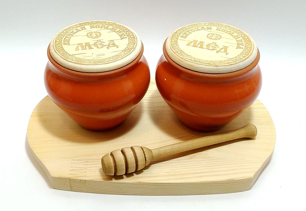 Набор для меда из 2-х горшков 0,25 л с деревянными крышками (верхний слой из бересты). Ложка для мёда